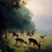 They form a gentle and majestic brood, A harmony of beauty and of grace. The fallow deer emerge from the woods.