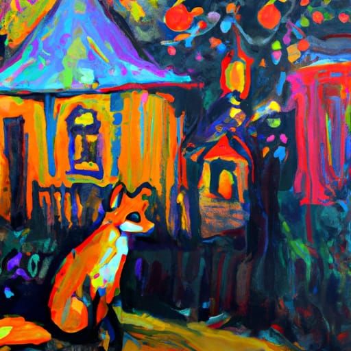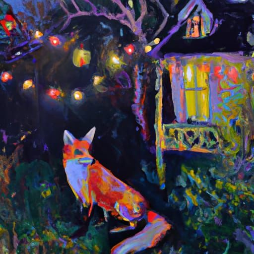 A fox at dusk sits by a bungalow And watches as the fairylights and lanterns glow He hears the music of the jazz band play And feels a sense of wonder and dismay