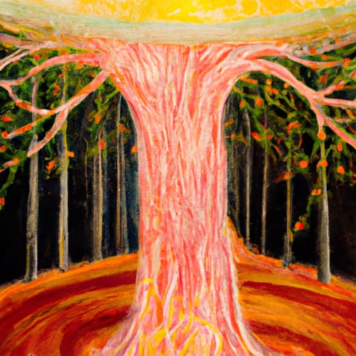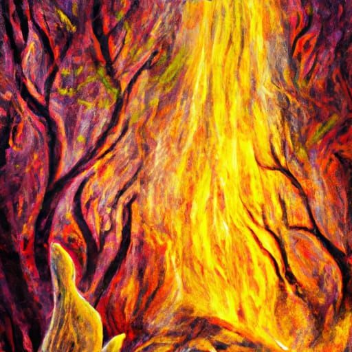 The forest burns with fierce and raging flames, That devour all the trees and plants in sight. The smoke obscures the sun and sky with shame, And fills the air with darkness and with blight.