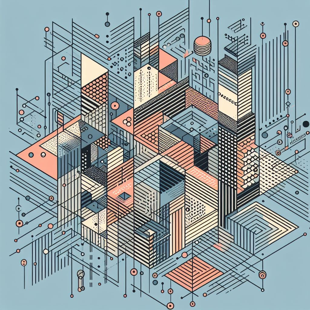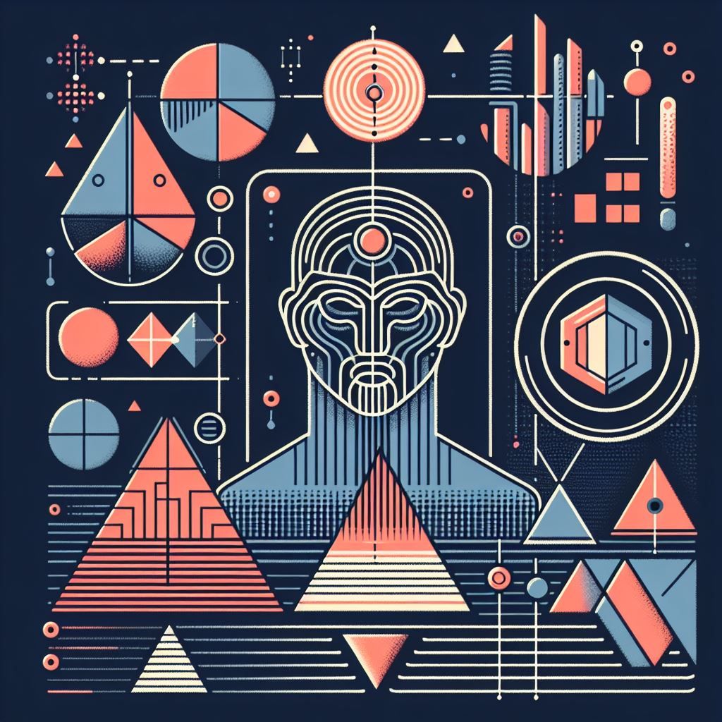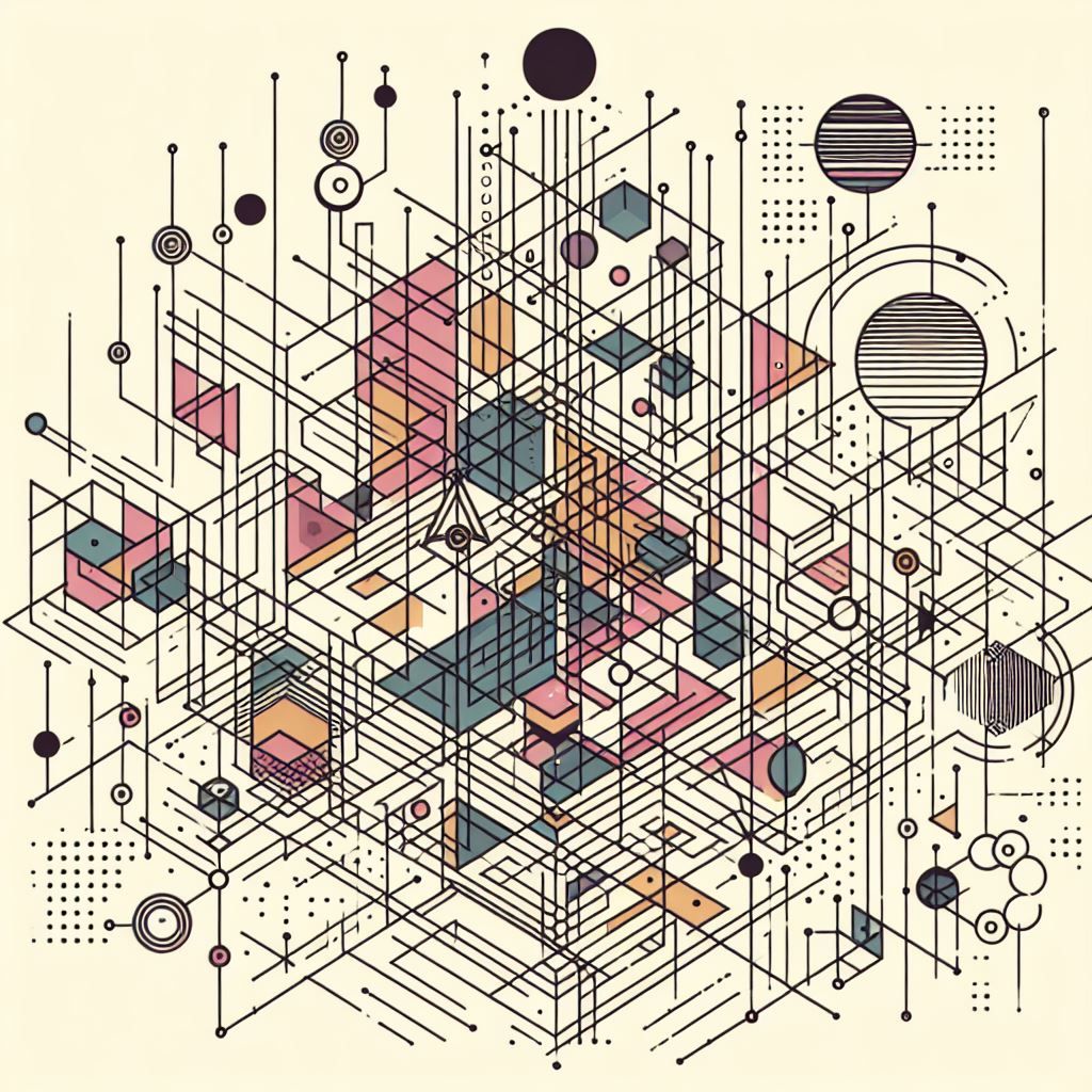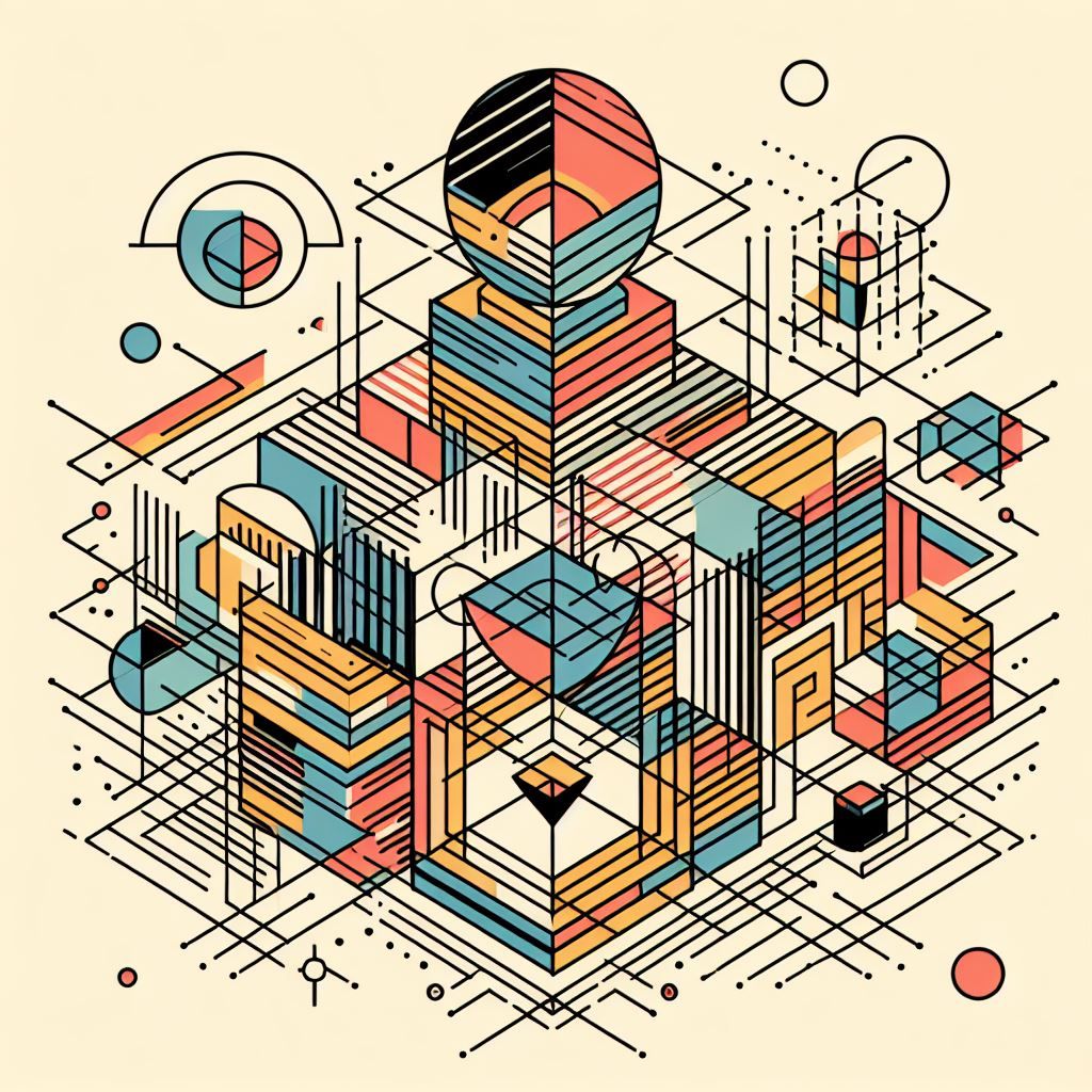 Lastly, behold the minimalist line art with triadic color complementary shapes, symbolizing the harmony of persistence and technology: