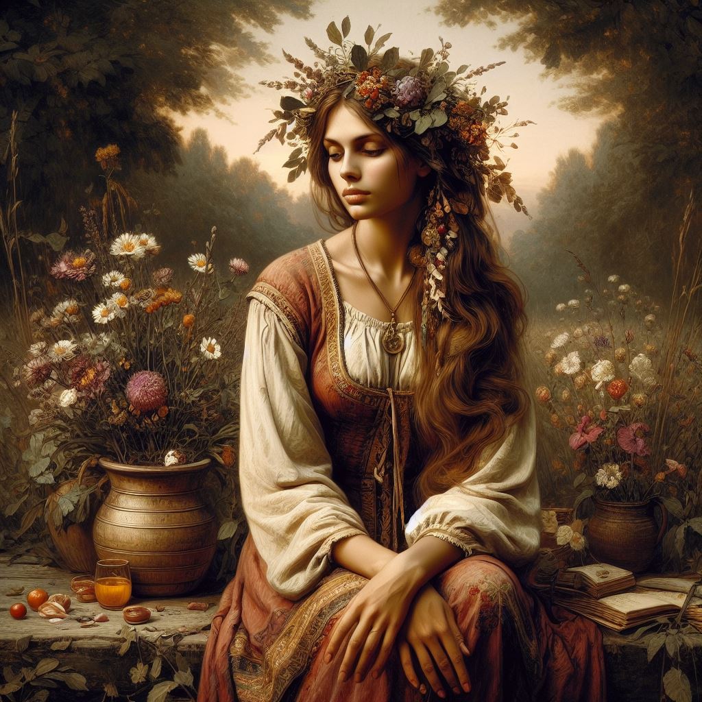 Upon her brow, a crown of russet hair,Vasilisa, fair as moonlight’s tender glow.Her eyes, deep pools where secrets ebb and flow,Hold tales of courage, love, and wild despair.