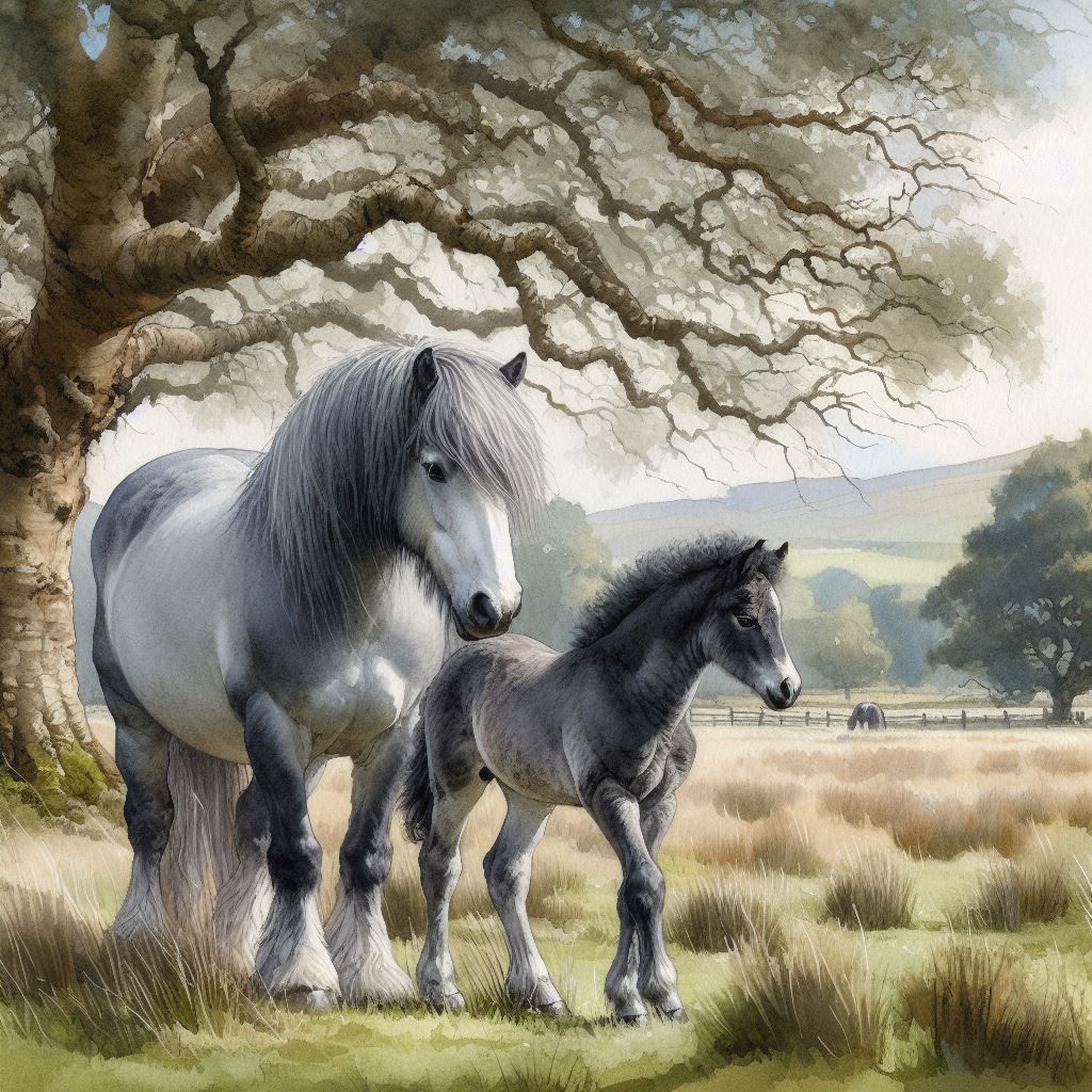 And there, a grey pony stands, her dark foal by her side, as if in a dance.