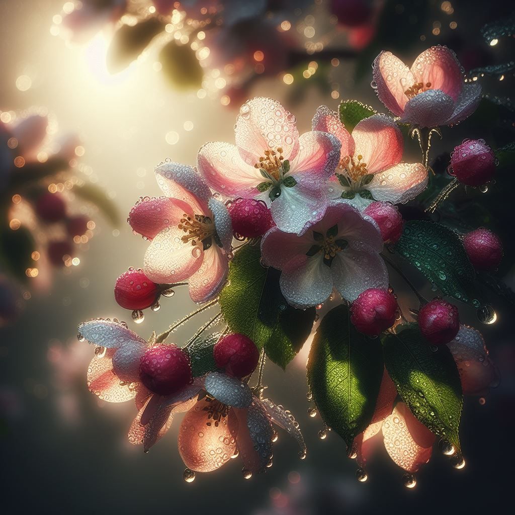 Image: Crab apple blossoms glistening after rain, by an anonymous wanderer. 🌸✨