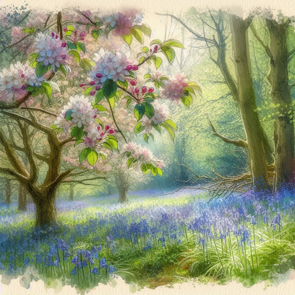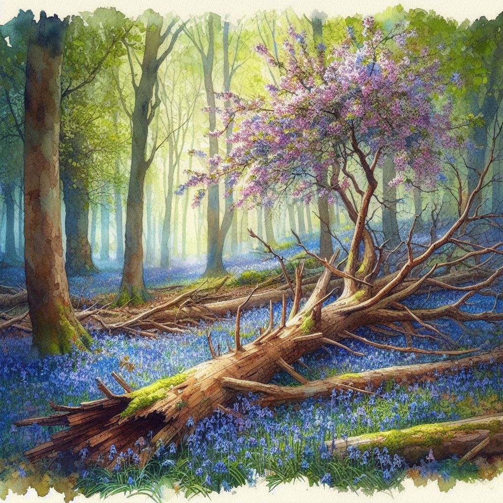 Amidst the April bluebells’ gentle sway, A gnarled and burred crab apple lies low, Its twisted limbs, once reaching for the day, Now rest upon the earth where wildflowers grow.