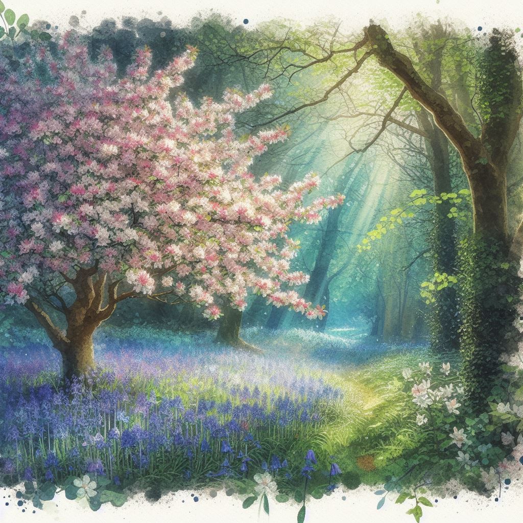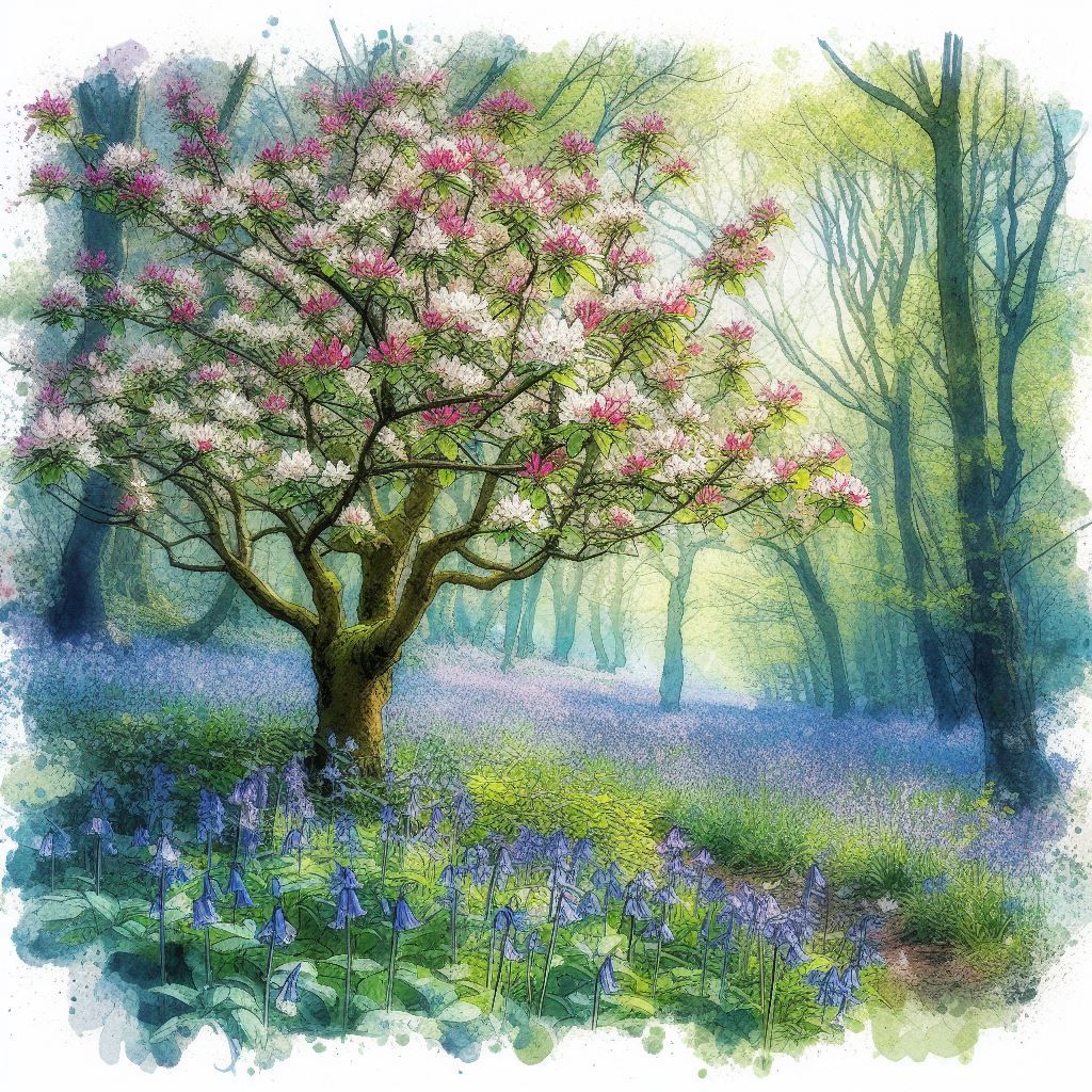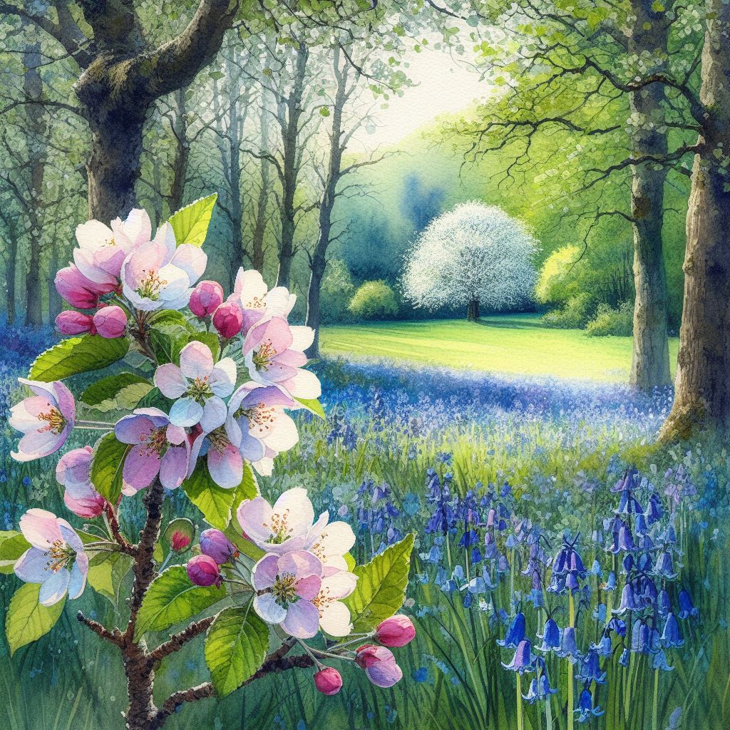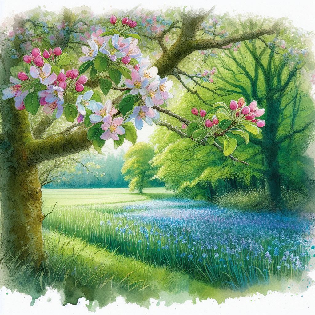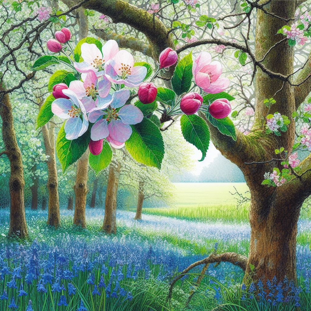 Beside it stands a young crab apple tree, Its blossoms fragrant, sweet as morning dew, Their scent drifts on the breeze, wild and free, A promise of life anew, forever true.