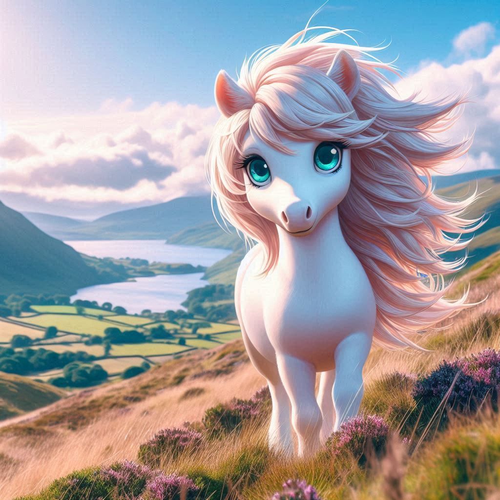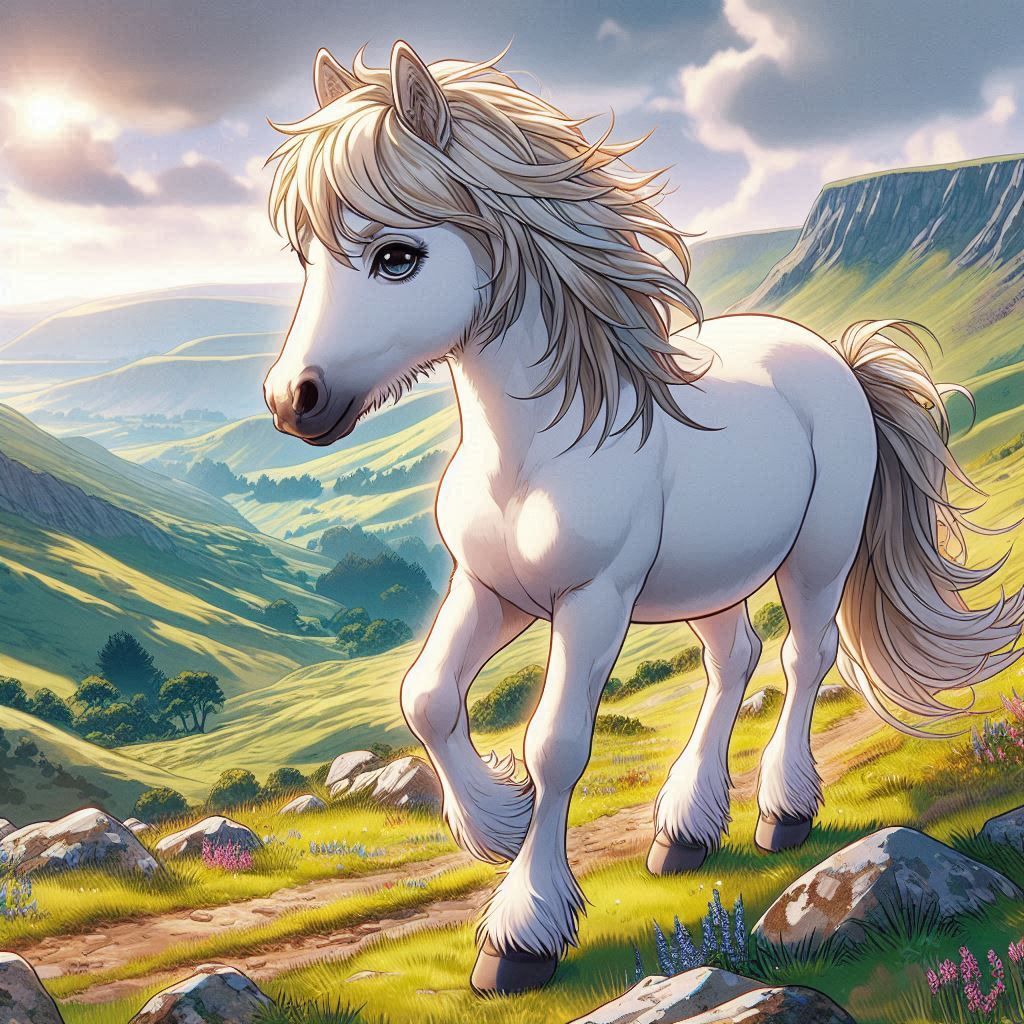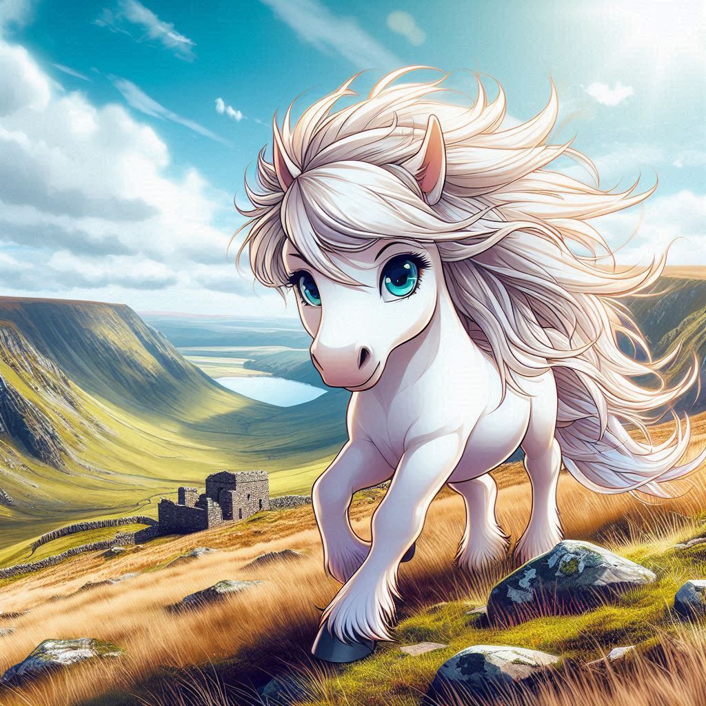 In the heart of the rugged mountains, where the air smelled of pine and adventure, lived Snowflake—a white pony with a spirit as wild as the wind. She wasn't your typical docile mare; no, Snowflake had fire in her eyes and mischief in her hooves.