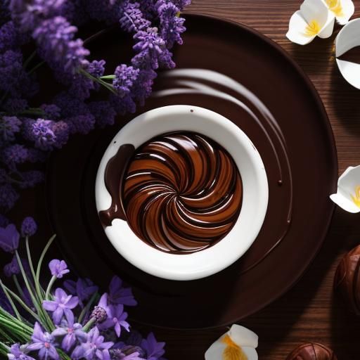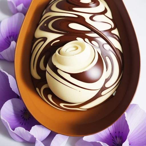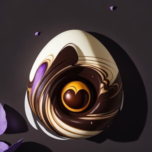 The canvas comes alive with swirls of lavender and cocoa brown. The Cacao Bloom stands tall, its petals capturing the play of light and shadow. The creme egg at its center glows like a hidden gem.