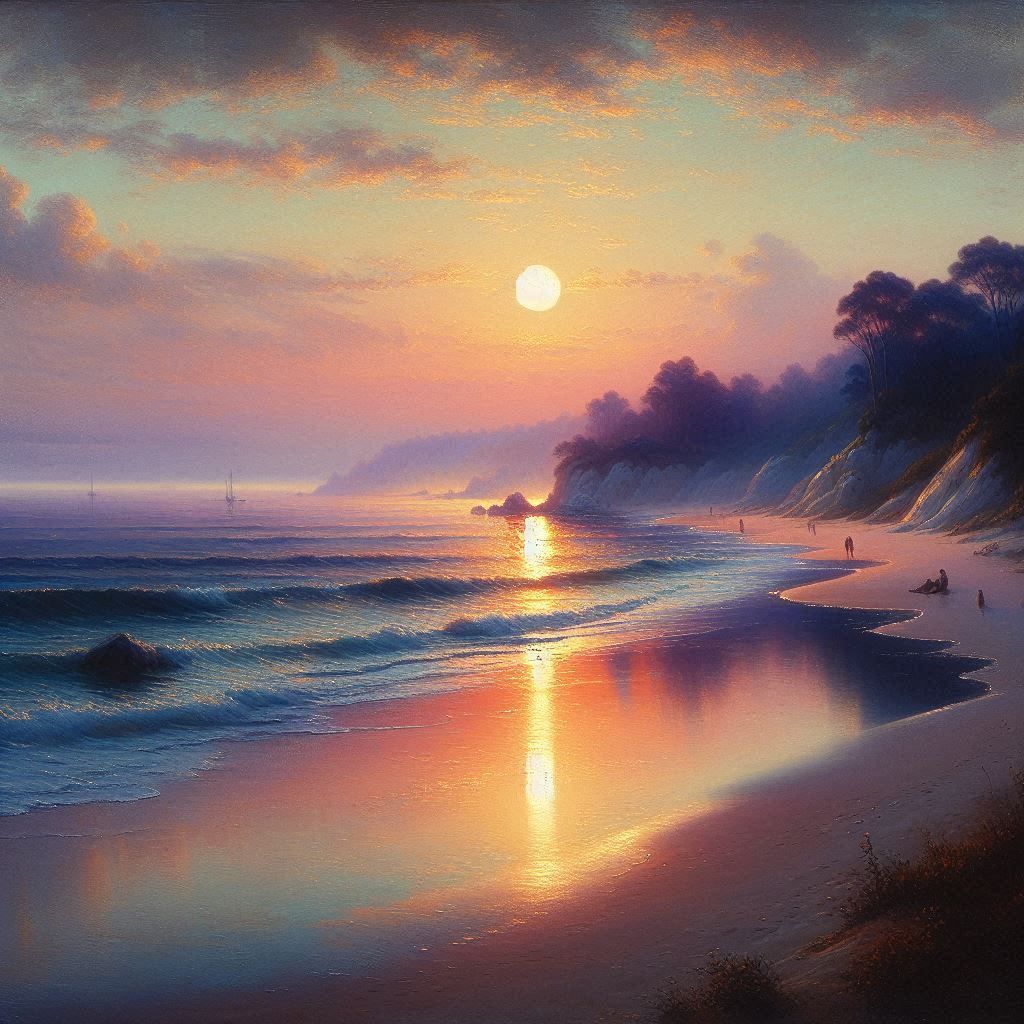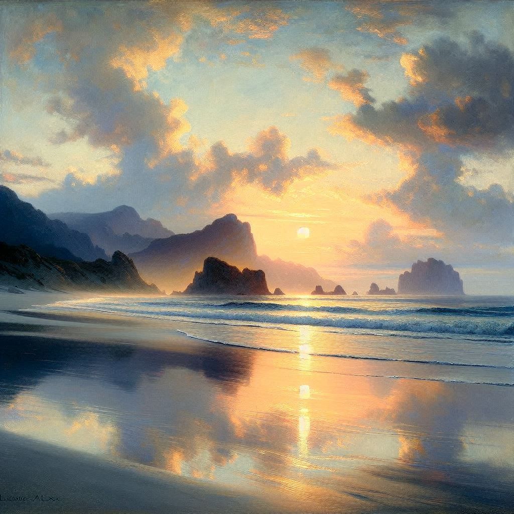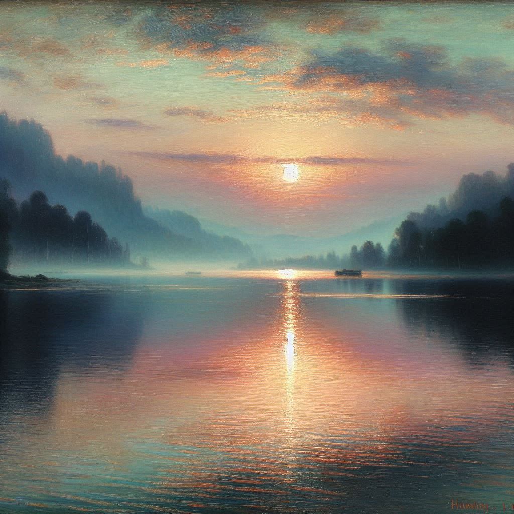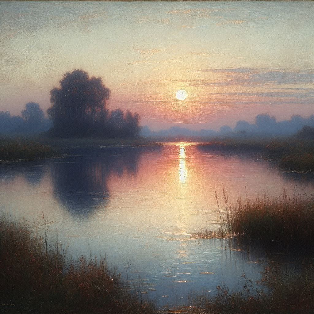In the luminist style, imagine a serene landscape: a secluded lake at dusk, its surface like a mirror reflecting the fading sun. The water shimmers, and the sky softens into pastel hues. The brushstrokes are concealed, emphasizing the timeless intimacy of the scene1.