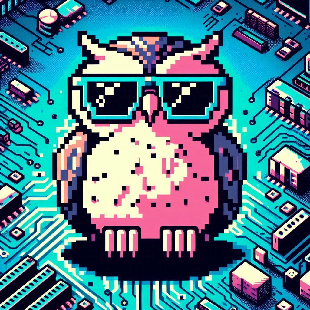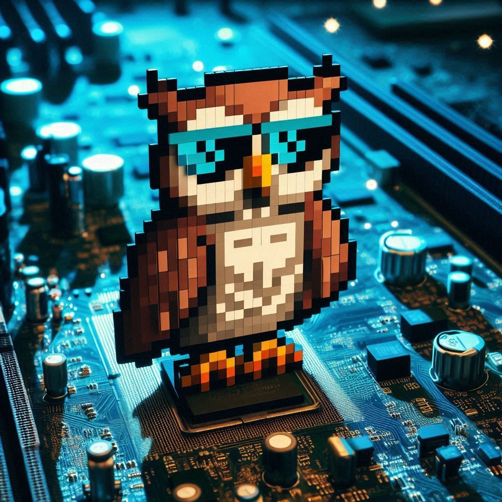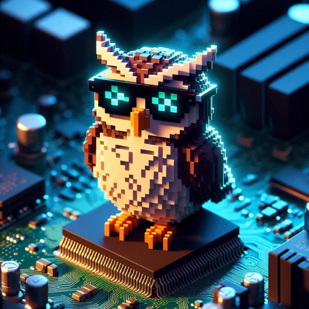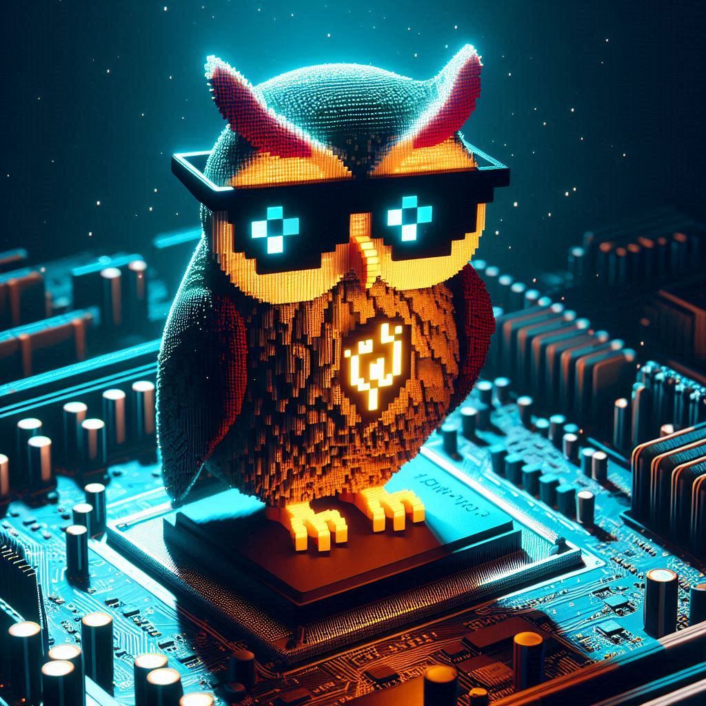 Image Prompt: !A pixelated owl wearing sunglasses, perched on a glowing motherboard, its binary feathers ruffled.