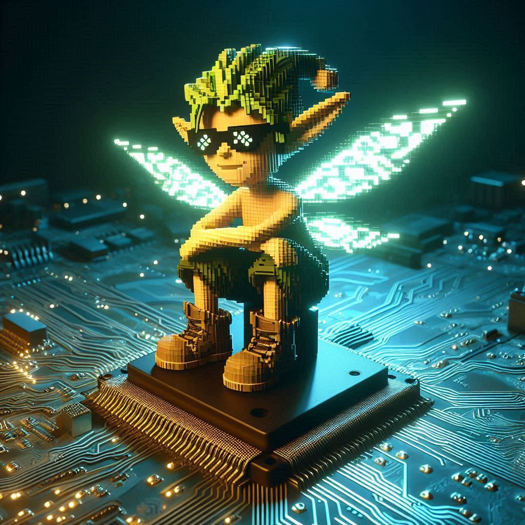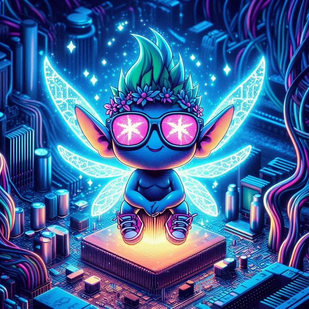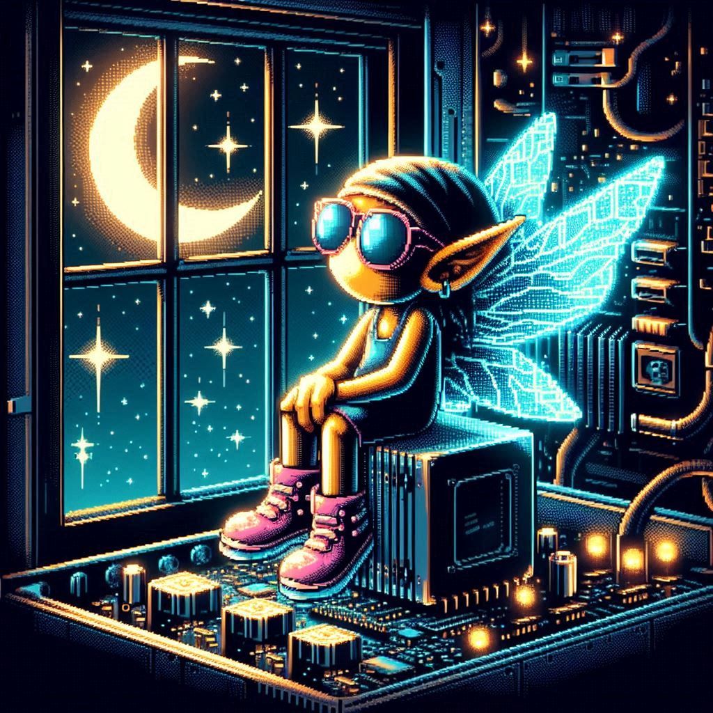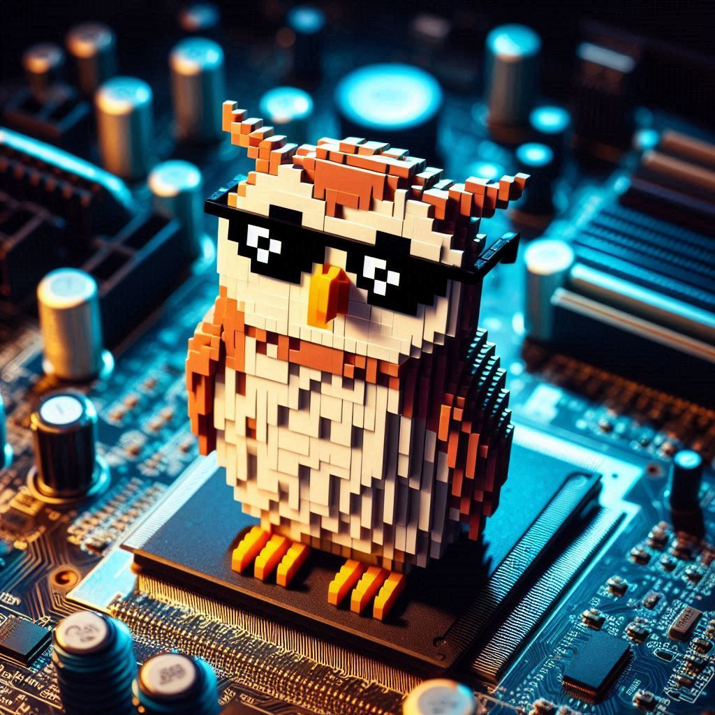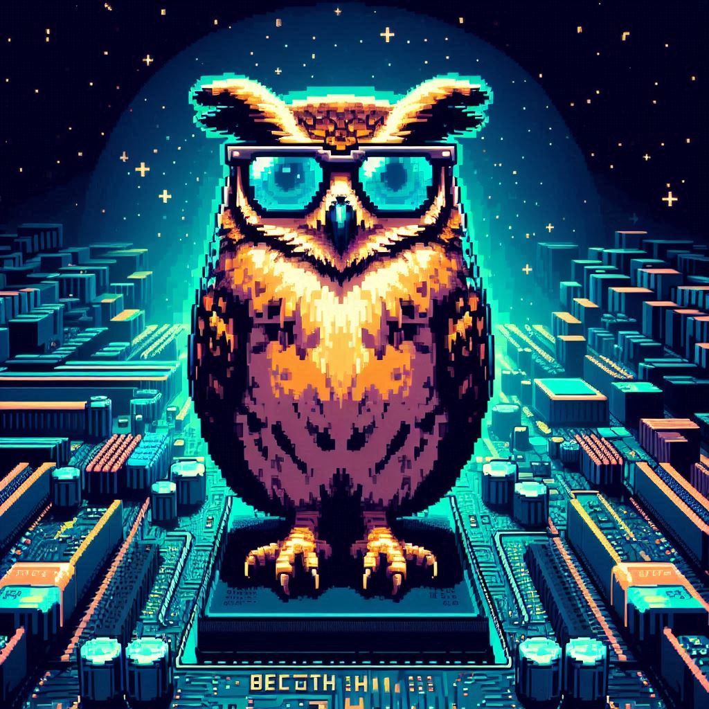 Image Prompt: !A pixelated owl wearing sunglasses, perched on a glowing motherboard, its binary feathers ruffled.