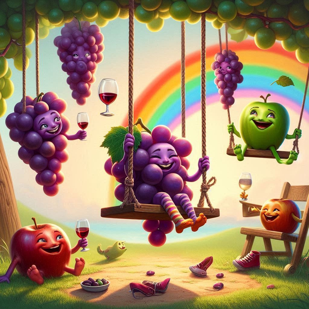 Once upon a sunny afternoon, in the heart of Fruitopia, there existed a grape named Gus. Gus was no ordinary grape; he was the ripest, juiciest grape on the vine. His plump purple skin glistened under the golden rays, and his laughter echoed through the grapevine.