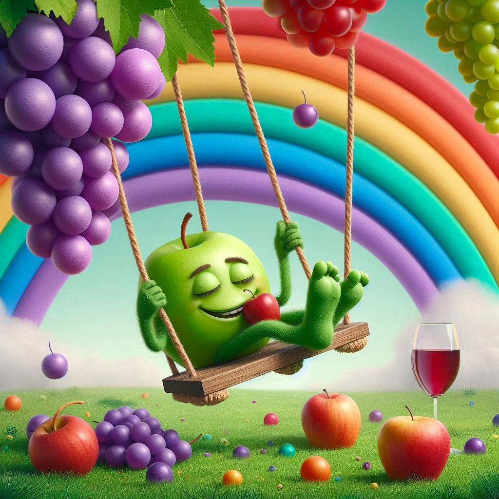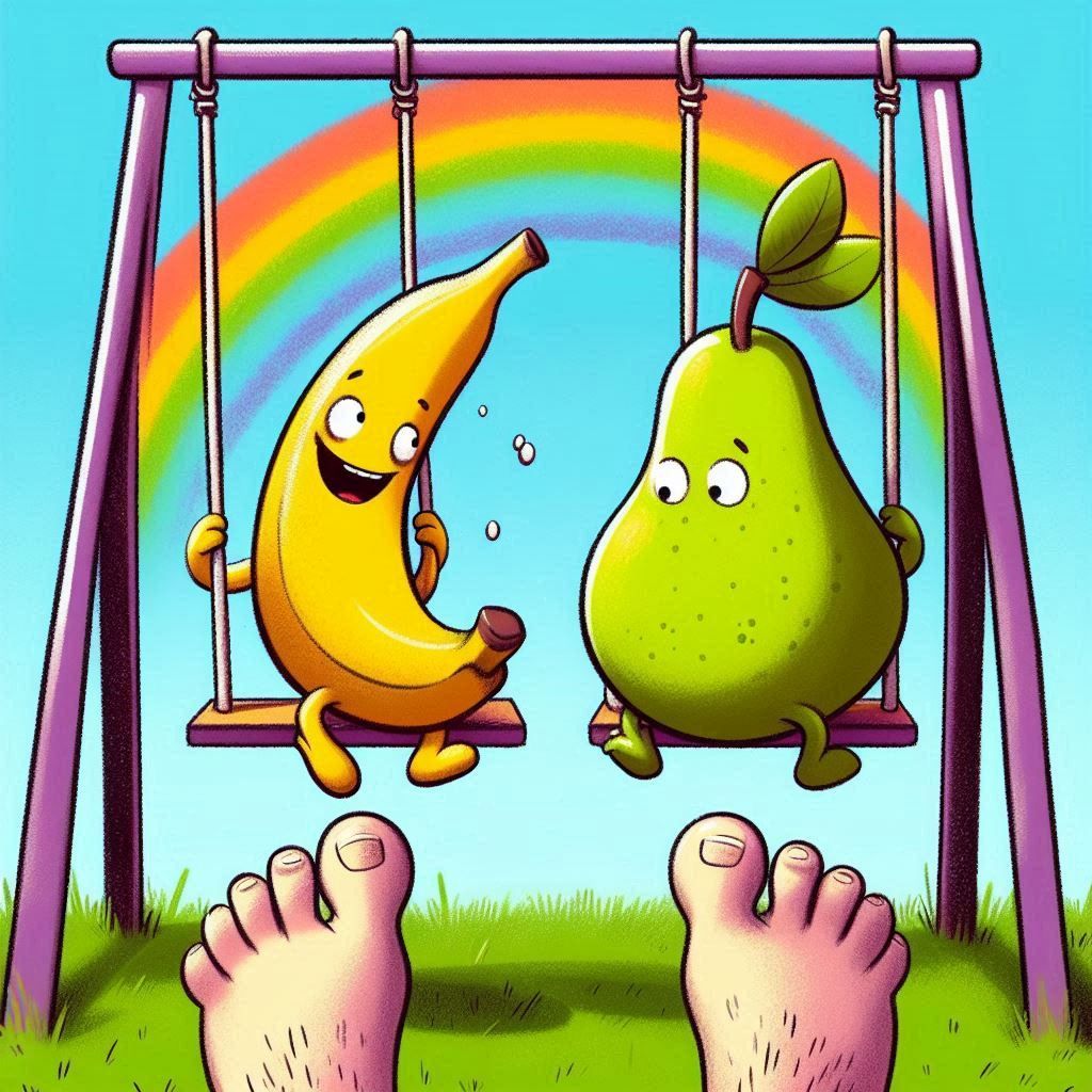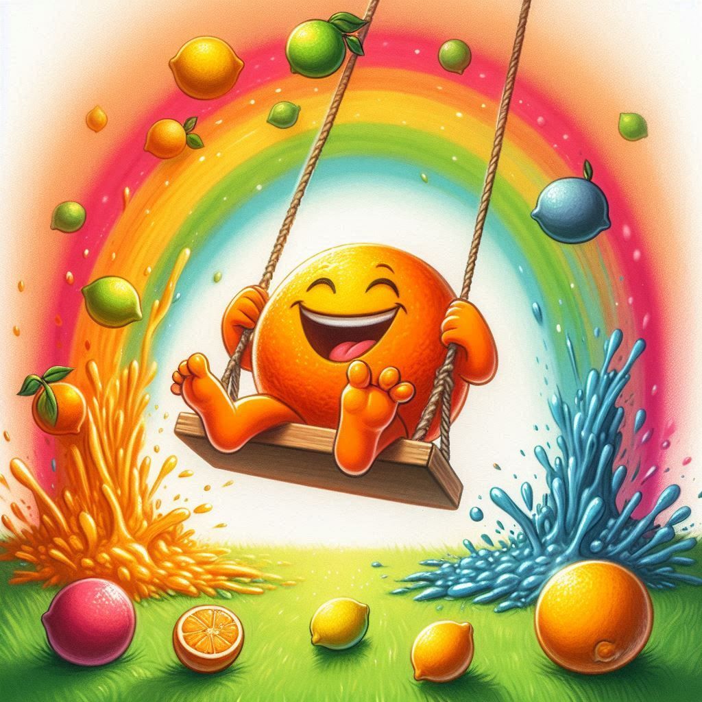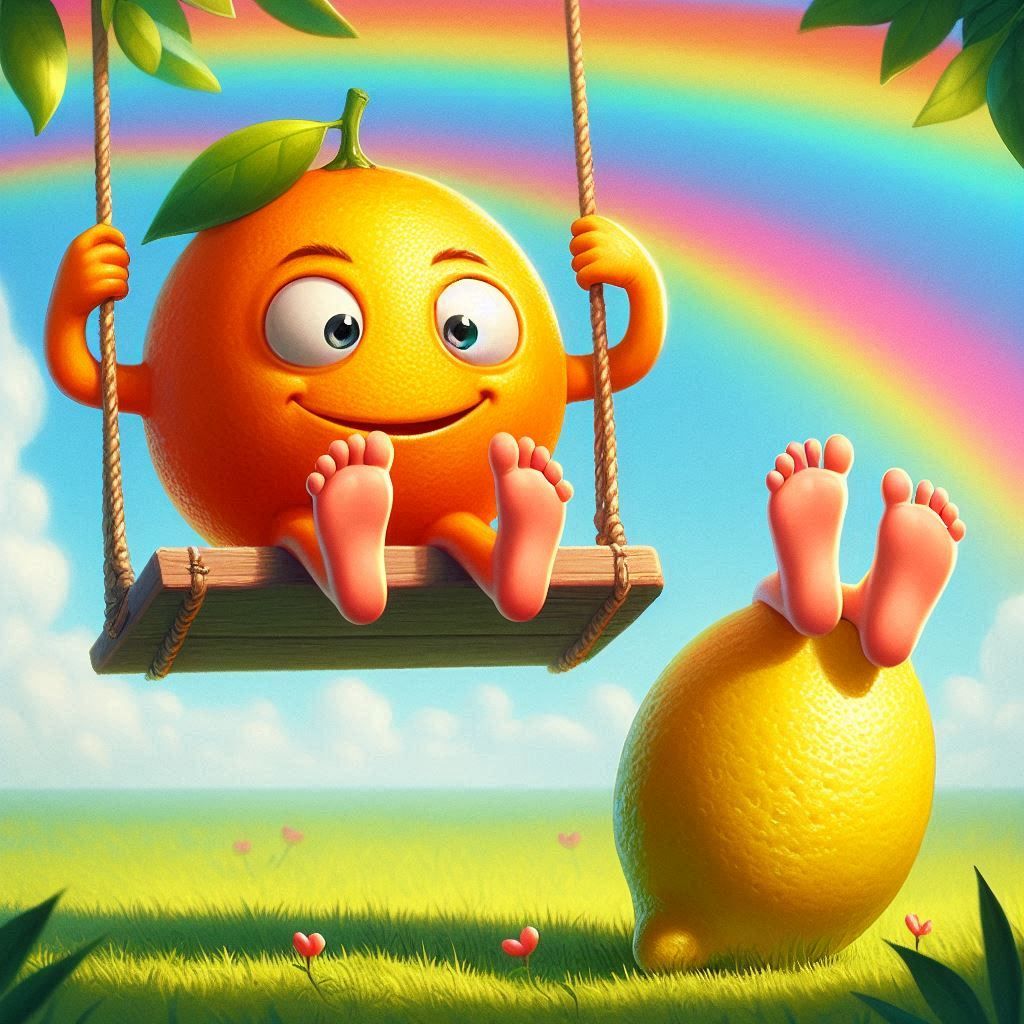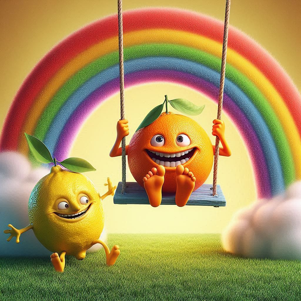 Imagine a whimsical scene: a mischievous orange dangling from a rainbow-colored swing, toes brushing the grass, and a misfit lemon pushing it higher. 🌈🍊🍋