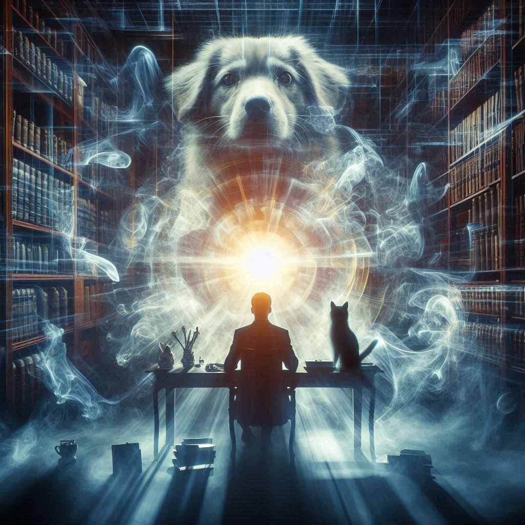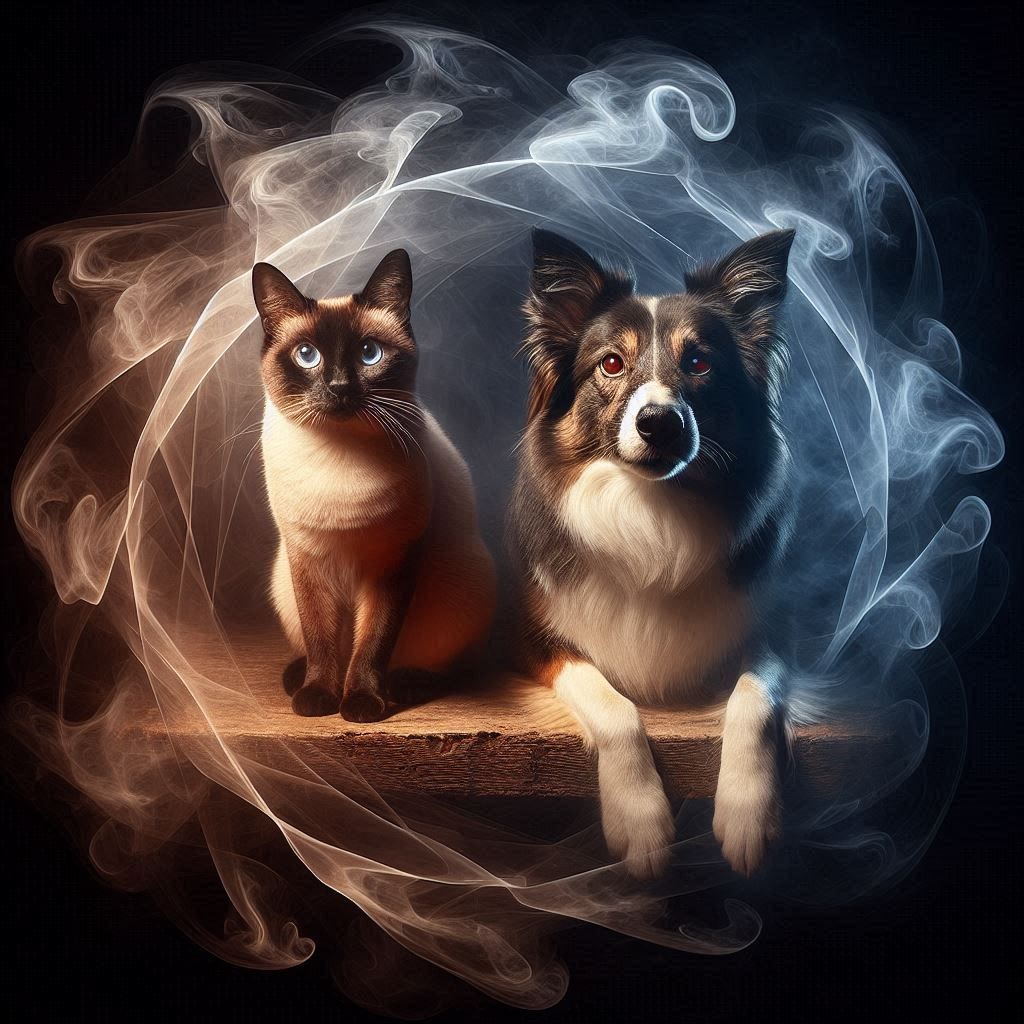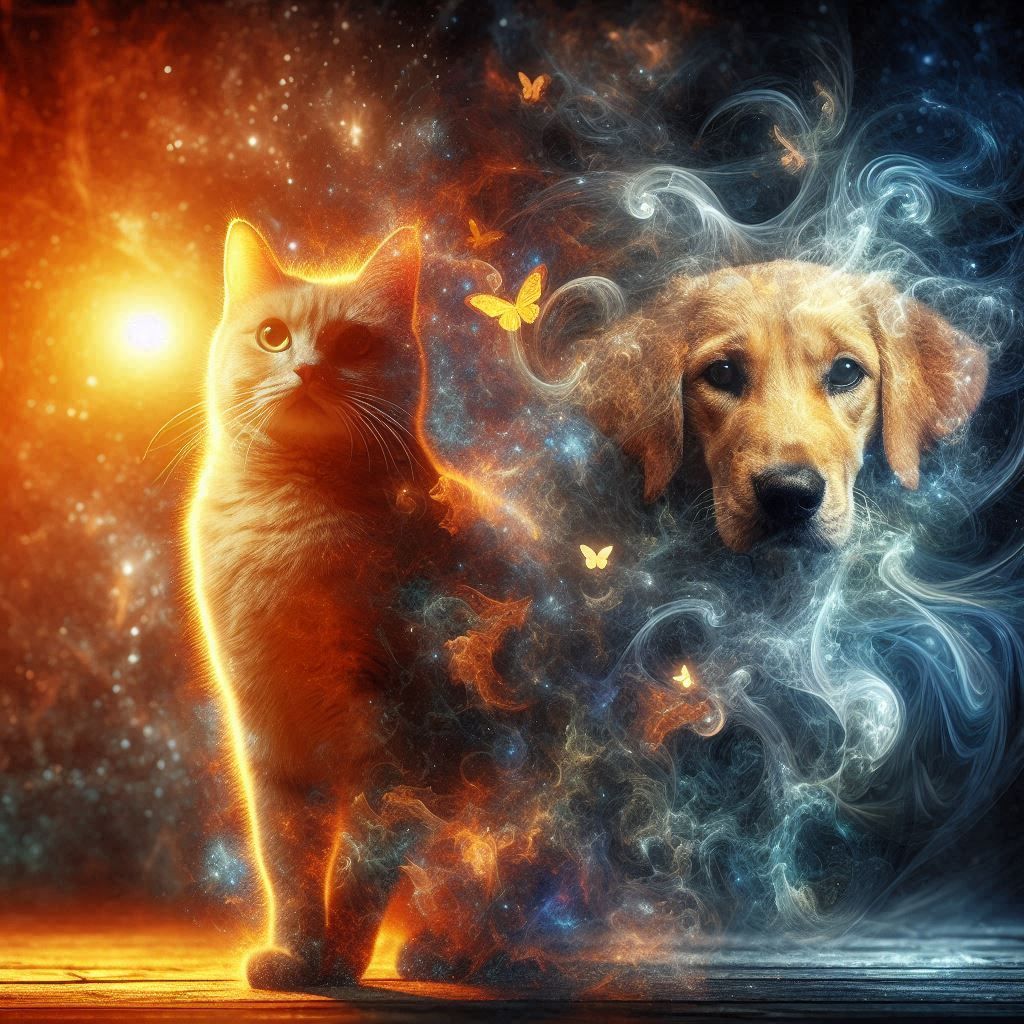Together they explore the night, In moonlit beams, a shared delight. The dog barks at the rustling leaves, The cat watches, calm and pleased.