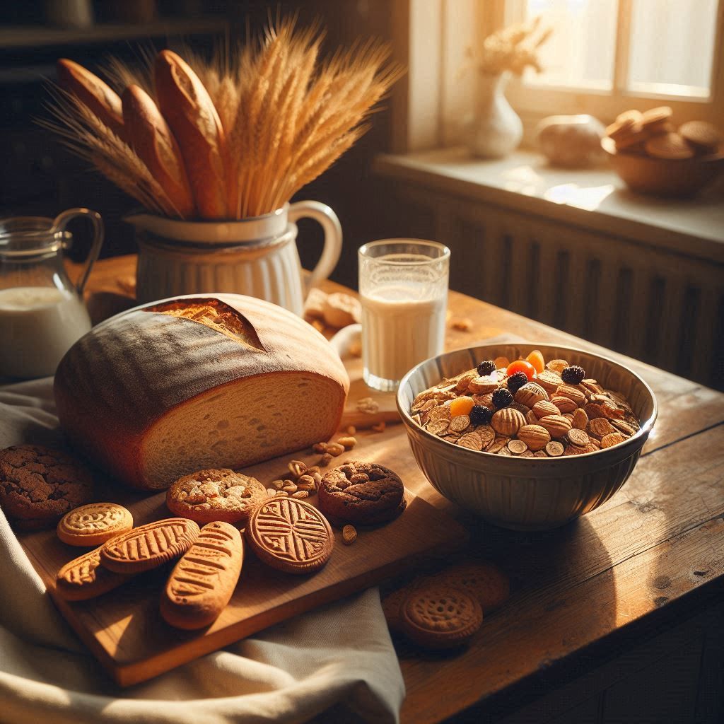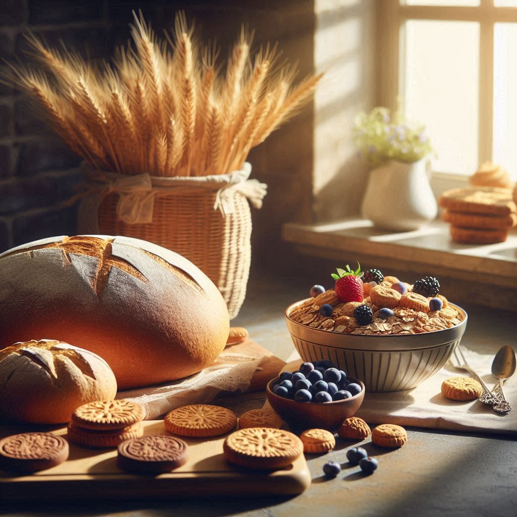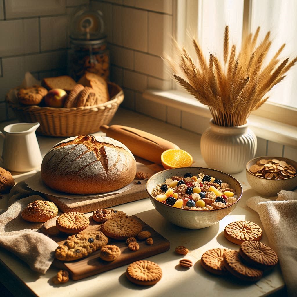 Image Prompt: Imagine a cozy kitchen scene with a loaf of freshly baked bread cooling on the counter, a plate of assorted biscuits, and a bowl of muesli topped with fresh fruits and nuts. The warm sunlight streams through the window, casting a golden glow on the wheaty delights.